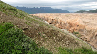 The trail wound toward and then along the base of the Buttress Range and soon we were walking beside the deep, narrow canyon that the River Lethe is relentlessly cutting through the ash. Blocks of ash from the nearly 100-foot canyon walls are eroding away as the river winds this way and that, eventually working its way down to bedrock and some semblance of its original pre-eruption course, on its way to the Savonoski River and eventually out to the Bering Sea.