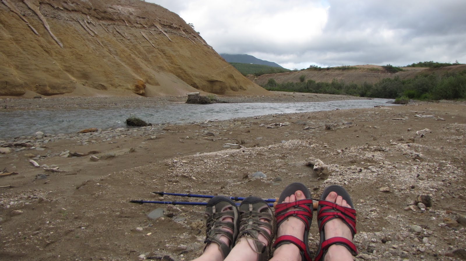 Monday morning dawned. We looked at our packs and groaned. We lifted our packs and really groaned. So we decided to ignore the entire mess and hope it would go away. We went out to lob some pumice and then have breakfast at the lodge where we drank gallons of coffee and diet coke and ate specially-prepared for me (Really! I know the breakfast chef!) bacon-mushroom-swiss cheese quiche and fruit and muffins. Afterward, we went back to my cabin and did the best we could with those packs, but in Alaska, with its unpredictable weather, you have to be prepared for a lot of surprises. How much spare dry clothing do you bring when it rains all the time? We didn’t need to carry much water at first because we could get it along the way – but there is none at the USGS hut so water for nearly 2 days (and how much is that?) ultimately had to be carried for a few miles from the spring. Food? Sue had bought some “backpacker’s dinners” and granola breakfasts, which seemed reasonable enough, but then there was lunch for 4 days, and snacks. You’d think after this many years of trying to get it right about packing the right amount of food and clothing, that I would finally get it right. This time, I just didn’t think of the peanut-butter-and-tortilla combo to last us the 4 days. Plus I like dry socks.
