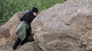 Our early breakfast of Pop-tarts and fruit cocktail didn’t last long, so after an early lunch at 11:00 we headed down the trail to Ukak Falls. This is the same trail that the Valley Tour visitors take except we were able to spend hours longer there, toodling around and stopping at every rock and viewpoint. We discovered paleo-channels in the walls of the ash cliffs, where, between 1912 and now, the rivers coming off the glaciers of the Kejulik Mountains in the Aleutian Range have followed a course and dropped their load of gravels before cutting a new channel through the welded ash that is the Valley of Ten Thousand Smokes. We examined the granites that had been transported down (by gravity and glaciers) from the Aleutian Range batholith (magma that had crystallized underground, forming a massive body of igneous rock which is at least 100 square kilometers in size) – quartz, feldspar, and probably pyroxene were the most obvious minerals we saw with our hand lenses. The ash cliffs have been cut by wind and water into hoodoos, tall spires in spindly shapes that remind many visitors of Bryce Canyon in southwest Utah. We scratched at the lithic tuff – rocks and boulders of welded ash eroded from the cliffs and containing rock fragments and many smaller crystals of mostly feldspar and quartz and pyroxene. In the cliff walls could be seen the fossil fumaroles or steam vents, oxidized remains of minerals in the groundwater that had turned to steam as the 2000° F ash from Novarupta blasted its way down the once lush and green Valley.