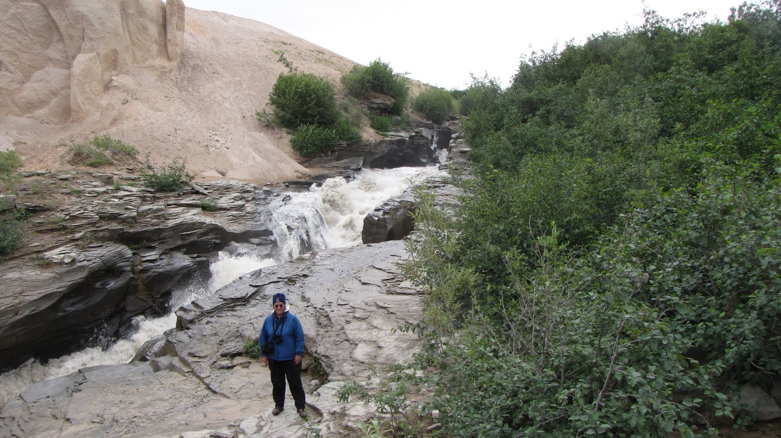 A few weeks ago MY FAVORITE TRAVEL AGENT, CAR BATTERY EXPERT, AND SCREEN DOOR REPAIRMAN wrote me about the 113 degree temps in St. George UT and said that the gravel in his front yard was melting. Coincidentally, at the very same time he was complaining about – oopsie, I mean writing about – this, I was standing on the lower river observation platform in the rain while wearing every single piece of outerwear I had bought or brought with me. Besides my regular uniform of pants and shirt and water-proof shoes and socks, I also had on rain pants, a sweater, fleece jacket, a gore-tex parka with the hood up, a ball cap, beanie, and 2 pairs of gloves.