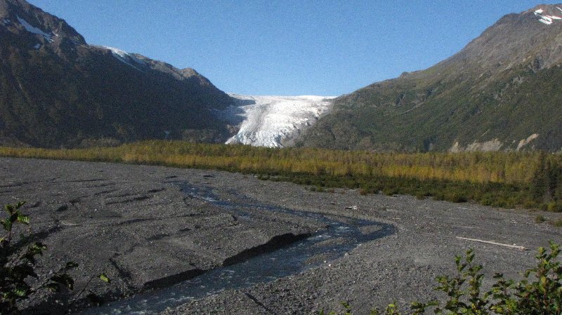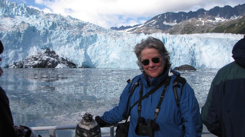 The next day my agenda included the Exit Glacier area of Kenai Fjords National Park, a short drive from Seward. This is the only place in the park where you can walk up to the edge, or toe, of the glacier. There are several hiking trails â I chose the lower mile or so âEdge of the Glacierâ trail to quickly get up close and personal with the ice. The trail traverses the lateral moraine in a narrow valley â rocky rubble scraped up and pushed to the side by the glacier as it advances and left in place as the glacier retreats. There were glacial striations on every exposed rock surface and I was able to recognize the pitting and cavities in the rock caused by “plucking” as the glacier advanced over highly fractured bedrock. I was enjoying myself so much that by the time I got onto the Harding Icefield Trail it was 2:00 PM, a little late for this old girl to cover the 8-mile round-trip distance to the ice field and back. So I hiked up the trail for an hour or so and took my time coming back down. There was quite a bit of foot traffic about, and even though the visitor facilities had closed the previous weekend there were 3 or 4 rangers on roving patrol, this being their last weekend of the season, one week later than Katmai.