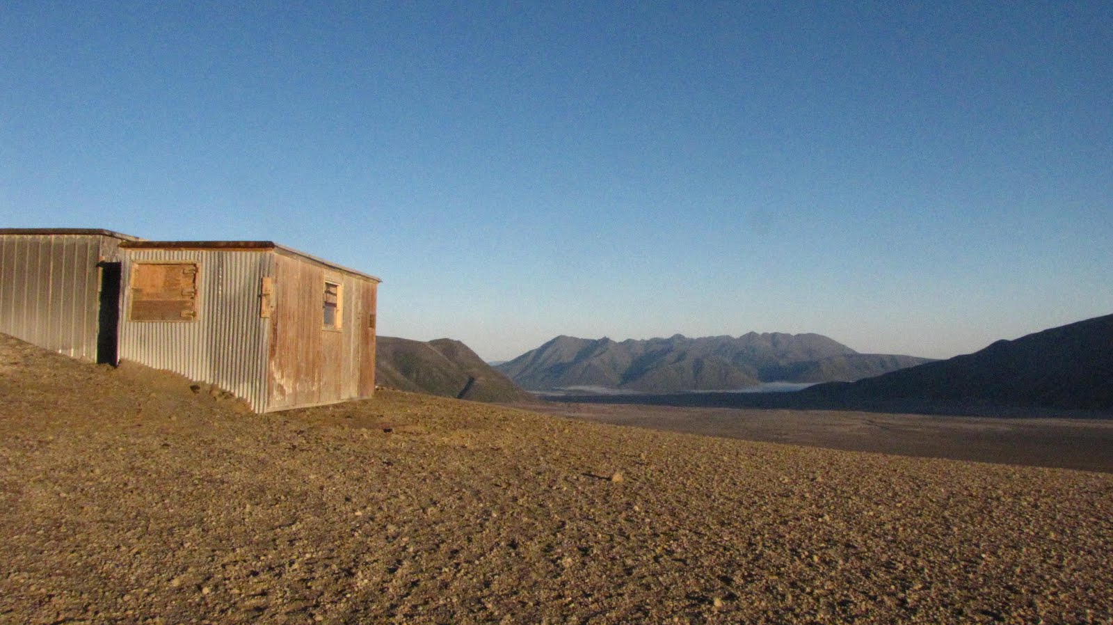We walked and walked and talked and talked. We stopped to snack after about 4 and ½ miles, and filled our water bottles with snow-melt cascading off the Buttress Range at the 6-mile campsite. We didnât treat it but just filtered it through Jeanetteâs bandanna to get rid of any silt. The Valley is wide open so we could see all the way to Broken Mtn., and then as we rounded a curve in the trail at the base of the Buttress Range we lost sight of Three Forks behind us and Baked Mtn. came into view ahead. This was our goal â the USGS research hut is located halfway up Baked Mtn. We would spend our 2 nights in the dusty shelter of its plywood walls. At the 6-mile campsite, if you are heading out into the Valley, you merely pull away from the Buttress Range and just head in the direction of whichever mountain is your goal.