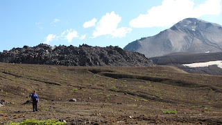 Soon I saw Jeanette and Robert coming up the valley towards the saddle â their route up Baked Mtn. had been quite sketchy and so theyâd come all the way down past the huts and taken the route up the valley. The slope from the saddle down to Novarupta was pretty steep and would be a real trial to get back up, but I had come too far to stop now! OK then, off we went, Jeanette and Robert running while I gingerly picked my way down. It was probably a mile or so at most to reach Novarupta from the saddle.