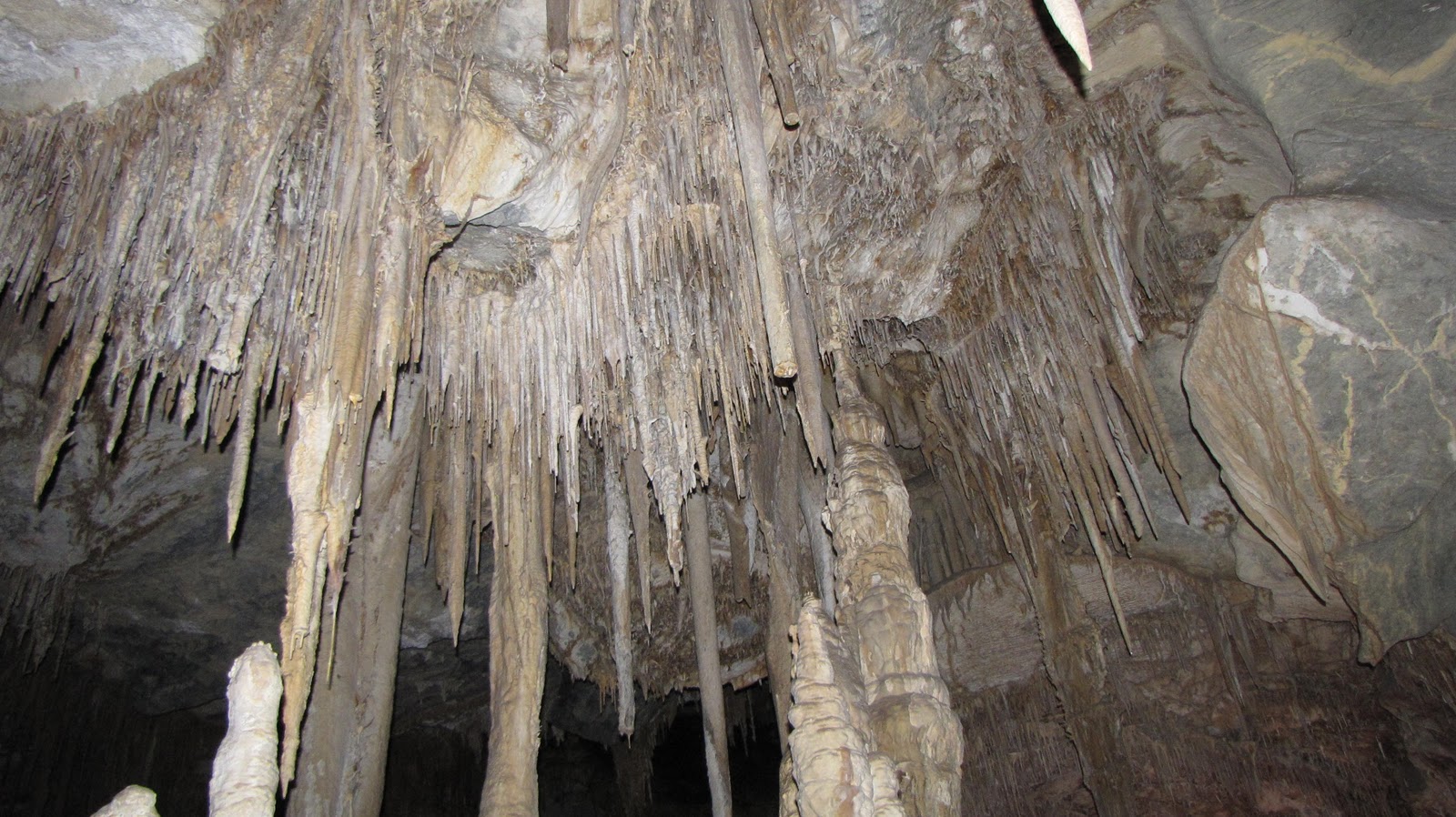 Lehman Cave is what’s called a solution cave. Over hundreds of thousands of years, ancient carbonate limestones, remnants of Paleozoic seas, were dissolved at the water table by acidic surface waters mixed with waters from deep below the surface. This acidic water dissolved the limestones and enlarged openings already present along bedding planes, fractures, and faults in the rock. In this way the caves eventually formed. As the water table dropped over time with the end of the last Ice Age, air-filled caverns emerged. Stalactites, stalagmites and other types of formations were created as dripping waters leaked into the now air-filled caves. Large thin round discs or shields of calcite are seen throughout the cave system and present a very dramatic sight as they “drip” downward from the dark recesses of the cave’s barely discernible ceiling. Lehman Cave stalagtites