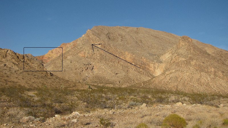 Thrusting (from tectonic compression of crust) where older Permian limestones (240 million years old) are thrust over younger Navajo Sandstone (in box), Virgin Mtns.
