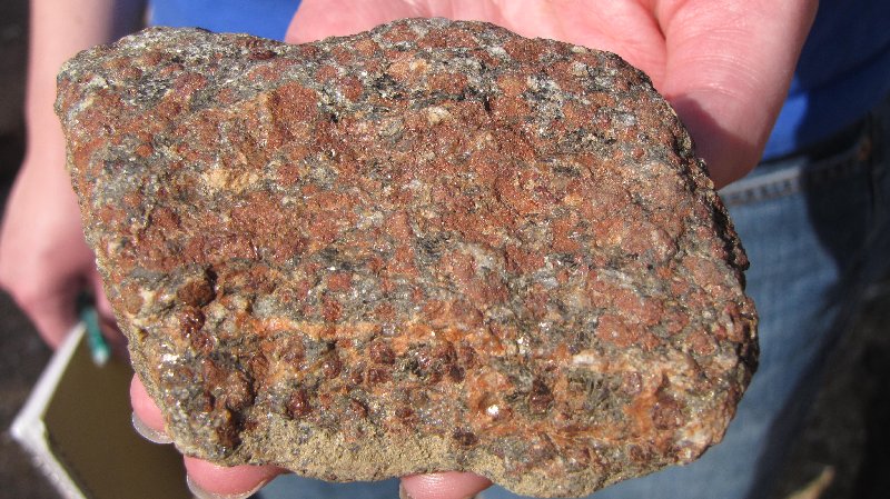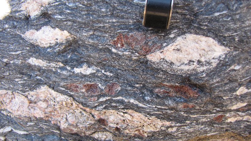 Sheared garnets in leucogranite intrusion, Virgin Mtns.