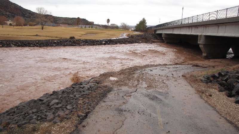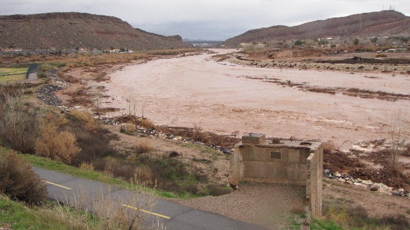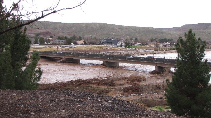 I wasn’t able to get ever to Zion today to get any photos – hopefully tomorrow. The North Fork of the Virgin River flows through the main Zion Canyon.The typical flow of the North Fork near Springdale (just outside Zion NP) is≈150 cubic feet per second (cfs). On Tuesday 12/21 @ 10:00 AM, the North Fork peaked at 5340 cfsAt 6:00 PM on Wed. 12/22 the peak flow was expected to be ≈4000 cfs