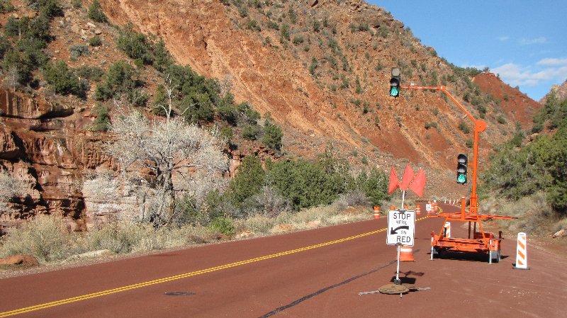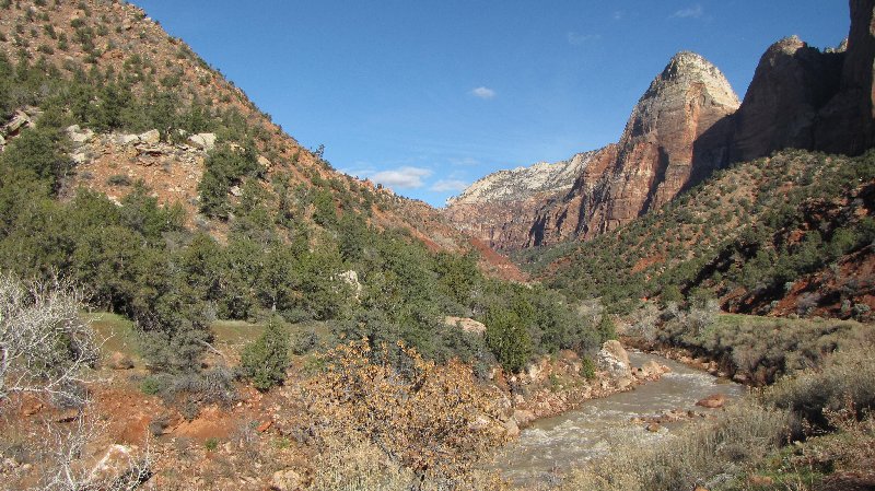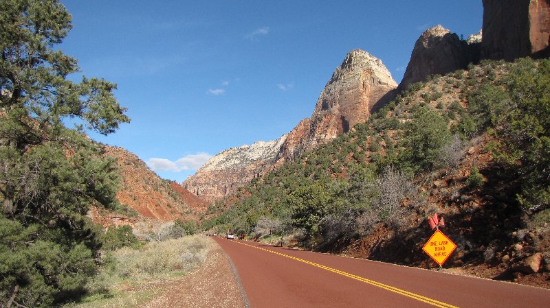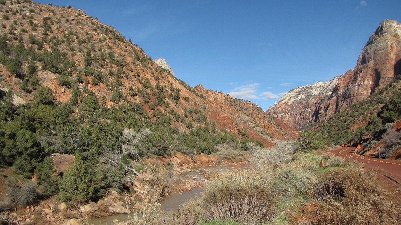 From the junction it is another half a mile or so to the slide area. This scenic drive follows the course of the Virgin River which is on the left side of the road as you travel up the main canyon.