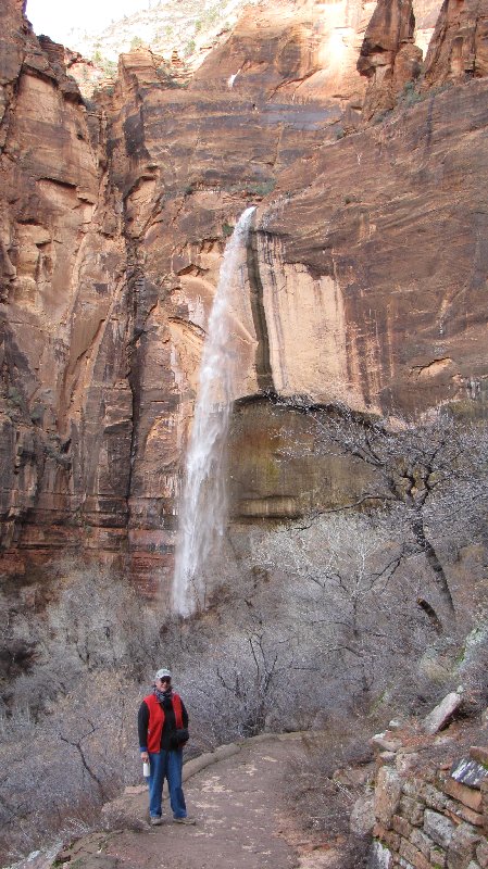 The waterfall actually drains Echo Canyon and smaller canyons feeding into it from the east side of the park. Without all this rain, though, this (creek? stream? run-off? pour-off? It has no name on my 1987 1:32000 scale Zion NP map) is generally sandy and dry with the occasional pothole full of remnant water and tadpoles. What is not visible (besides me!) in this last picture is the submerged trail as it curves into a narrows to the right.