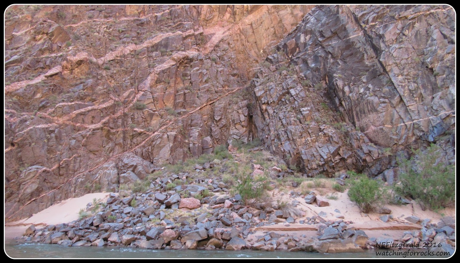 There is missing time here, between the metamorphic rocks and overlying Tapeats Sandstone. Over a billion years is unaccounted for in the geologic record. This is the Great Unconformity at river level.