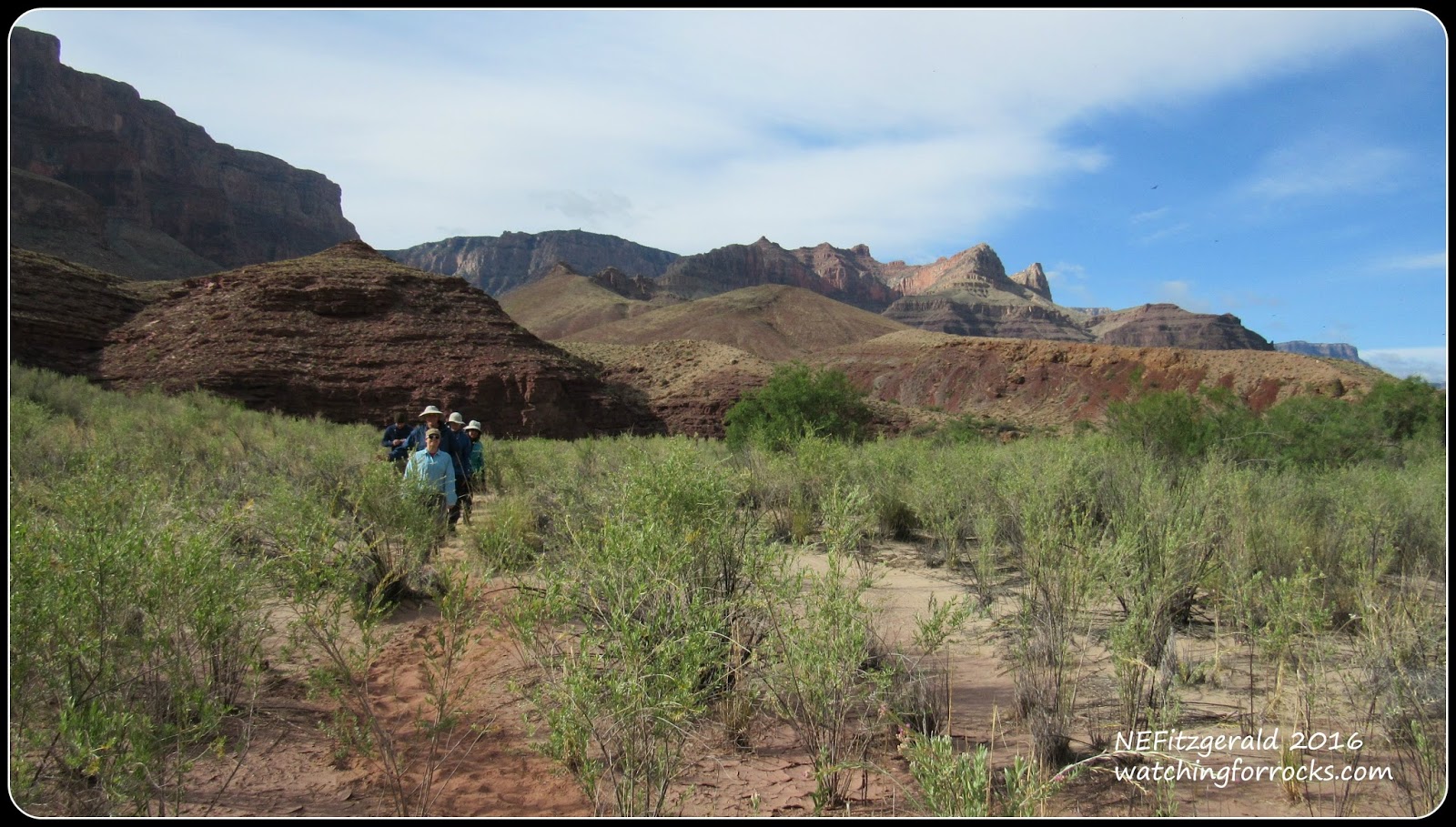 Saturday, May 9, 2015: Up early. Slept fairly well last night, after organizing sandy tent stuff and composing Friday’s journal entry in the dwindling daylight. Camped beneath walls of the Precambrian Dox Formation and Cardenas Lava. It looks like yesterday’s storm has passed, leaving lingering thready clouds and a sunrise reflecting orange on the distant cliffs. Or is it pink? Or burnished yellow–gold–chrysanthemum?